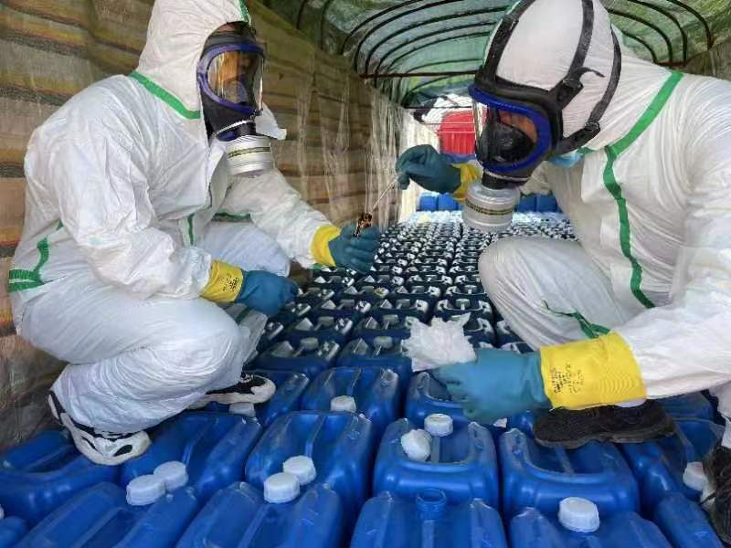 公安机关对易制毒化学品重点流失地区、流失路径、流失品种开展专项行动,依法打击相关违规行为和违法犯罪活动。(图为执法人员正在检查化学品运输车辆)20D禁毒在线
